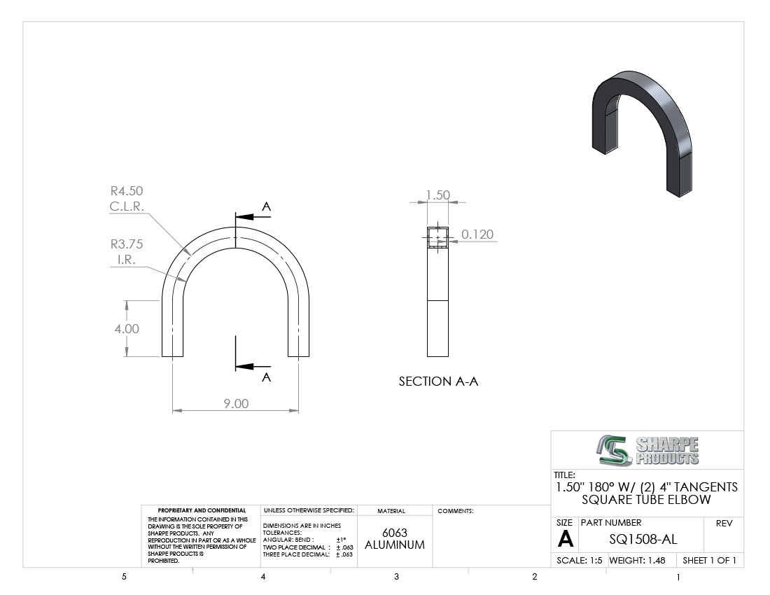 1 1/2 SQ. X .125 WALL 180° ELL 4.50 C.L.R. W/ (2) 4 TANS., ALUM 6063
