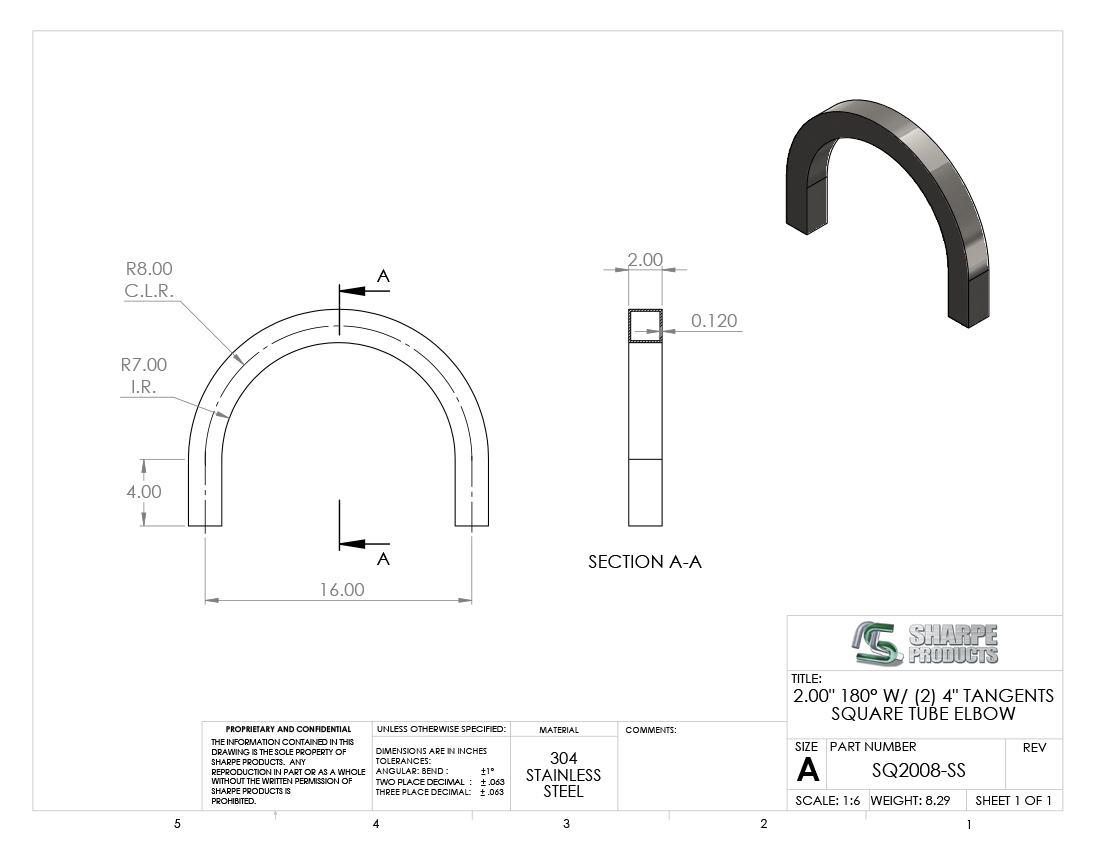2 SQ. X .120 WALL (11 GAGE) 180° ELL 8 C.L.R. W/ (2) 4 MIN. TANS., S/S 304 **MILL FINISH