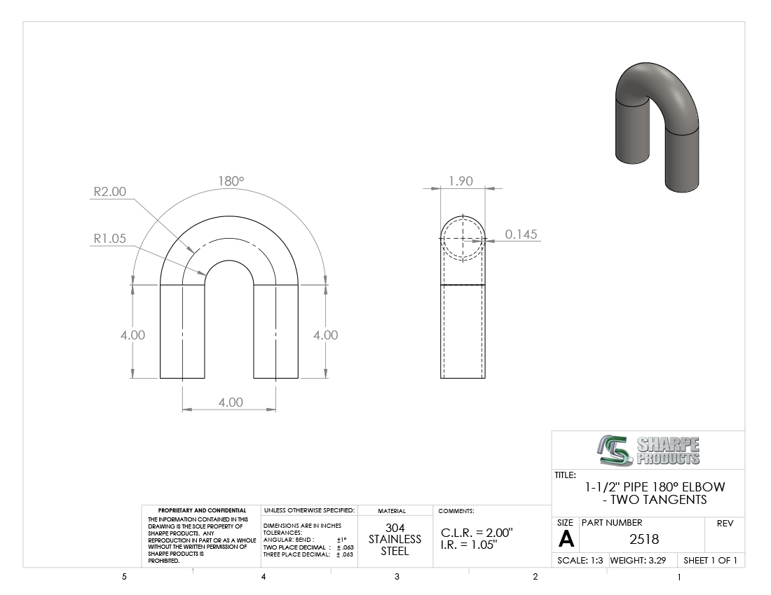 1 1/2 SCH 40 (1.90 O.D.) 180° ELL 2 C.L.R. W/ (2) 4 TANS., S/S 304/304L **PRE-POLISHED #4, NO TOUCH UP