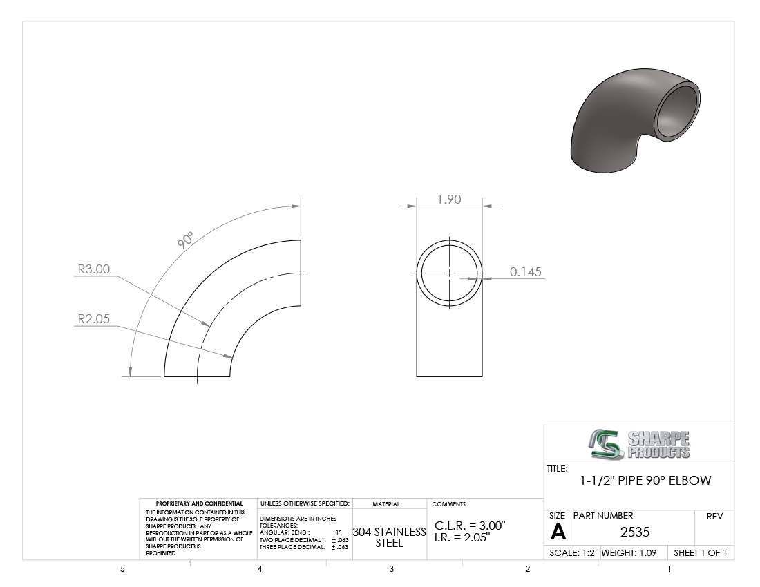 #2535 - STAINLESS STEEL 1-1/2" PIPE 90° ELBOW 3" C.L.R.