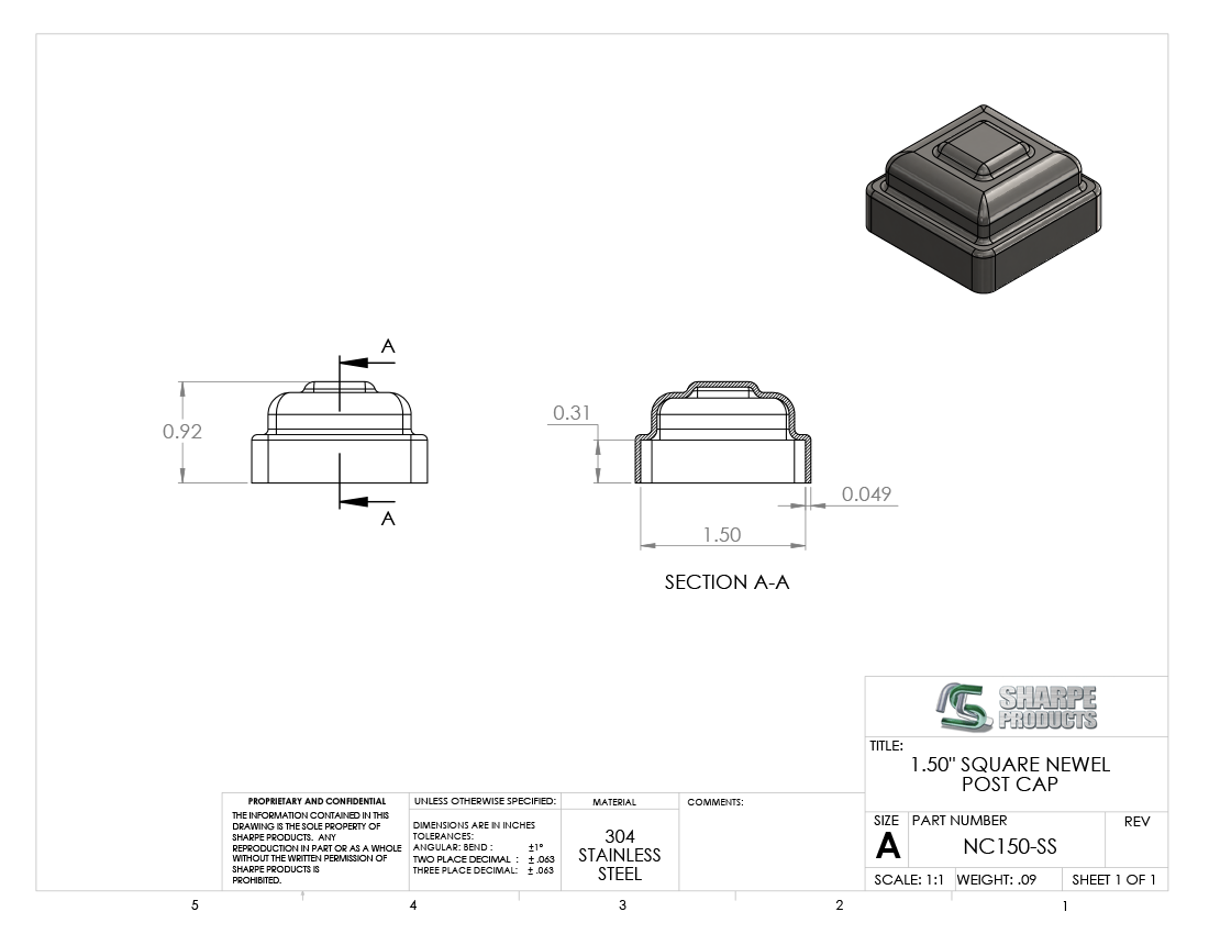 #NC150-SS - STAINLESS STEEL 1 1/2" SQ. TUBE NEWEL CAP