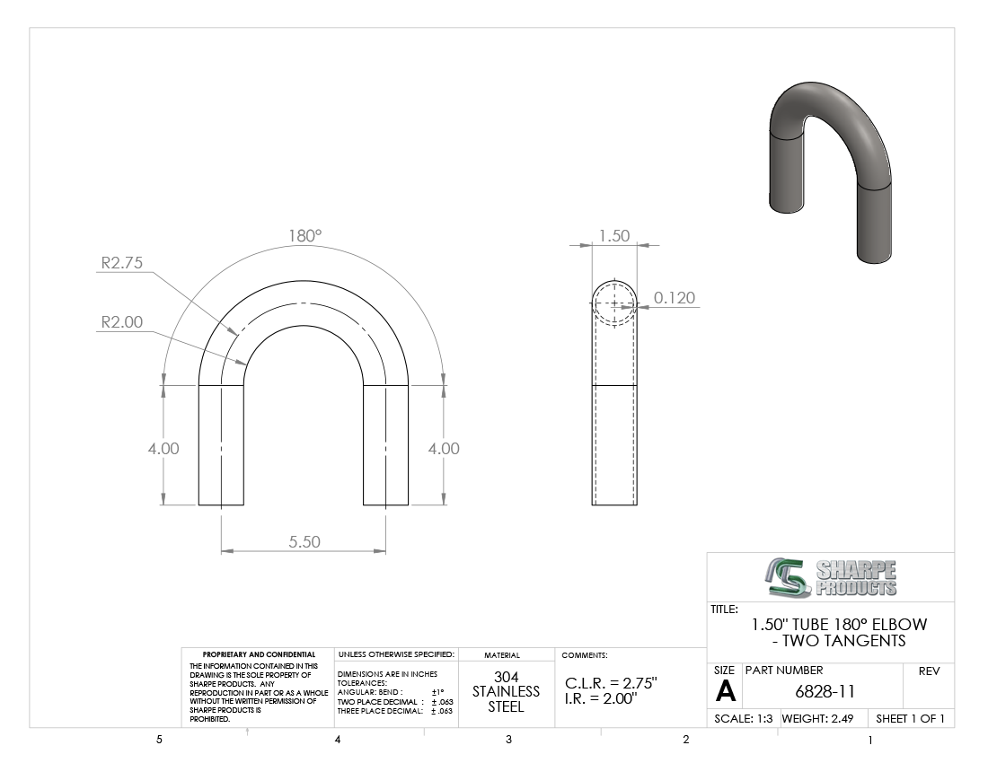 #6828-11 - STAINLESS STEEL 1 1/2" TUBE 180° ELBOW W/ TANGENTS 2.75" C.L.R.