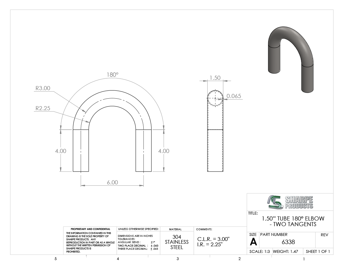 #6338 - STAINLESS STEEL 1 1/2" TUBE 180° ELBOW W/ TANGENTS 3" C.L.R.