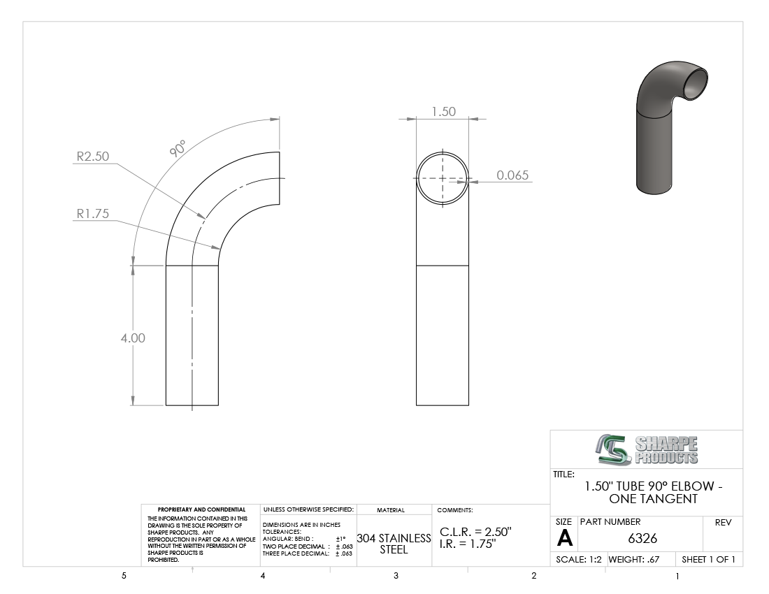 #6326 - STAINLESS STEEL 1 1/2" TUBE 90° ELBOW W/ 1 TANGENT 2.5" C.L.R.
