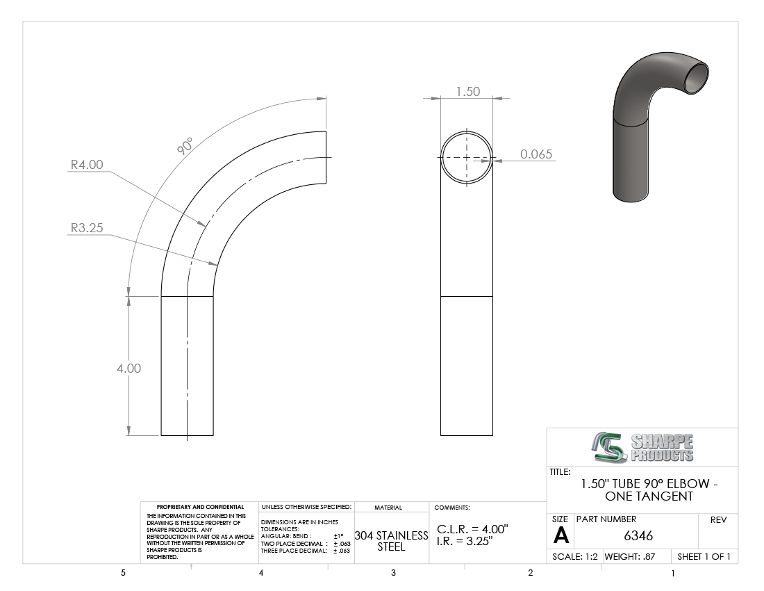 #6346 - STAINLESS STEEL 1 1/2" TUBE 90° ELBOW W/ 1 TANGENT 4" C.L.R.