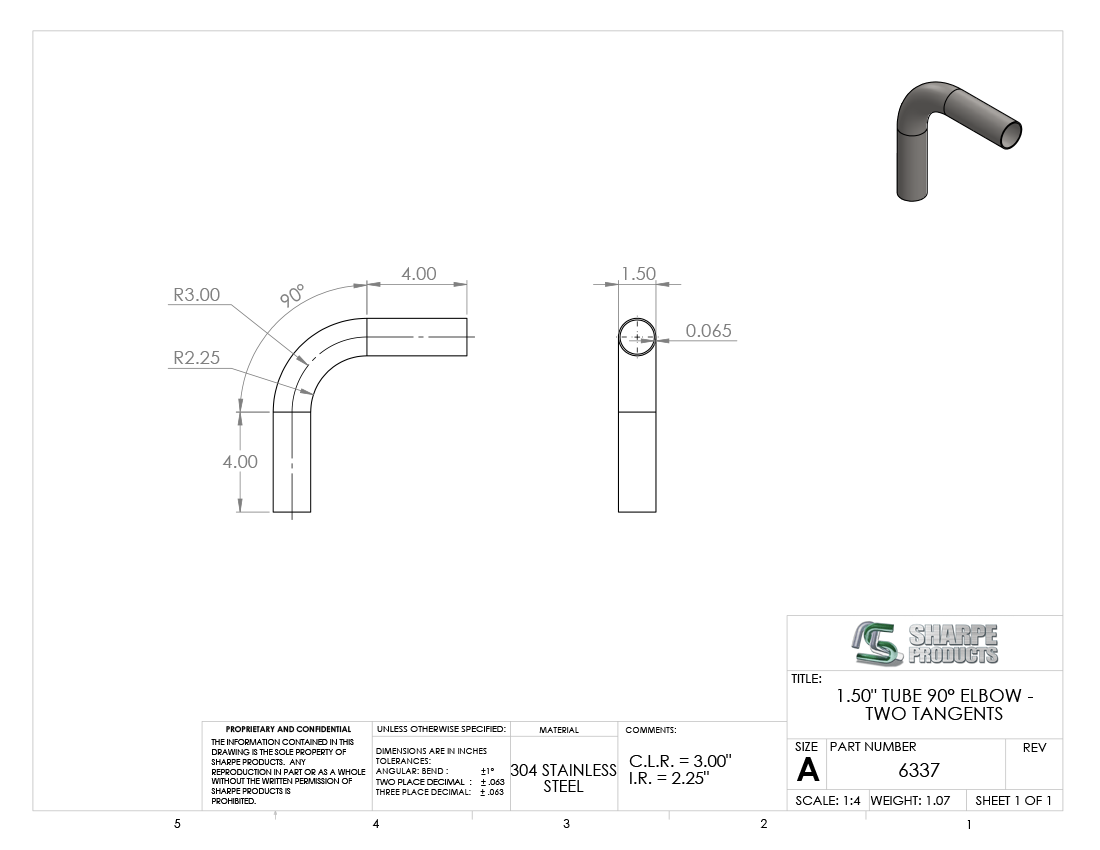 #6337 - STAINLESS STEEL 1 1/2" TUBE 90° ELBOW W/ 2 TANGENTS 3" C.L.R.