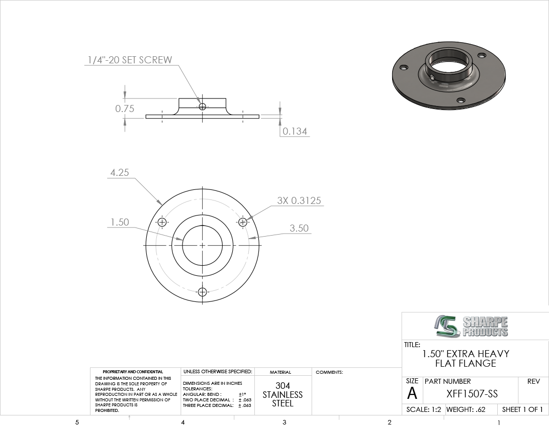 XTRA HVY FLAT FLANGE, 1 1/2 O.D. W/ (3) HOLES & SET SCREW, S/S 304