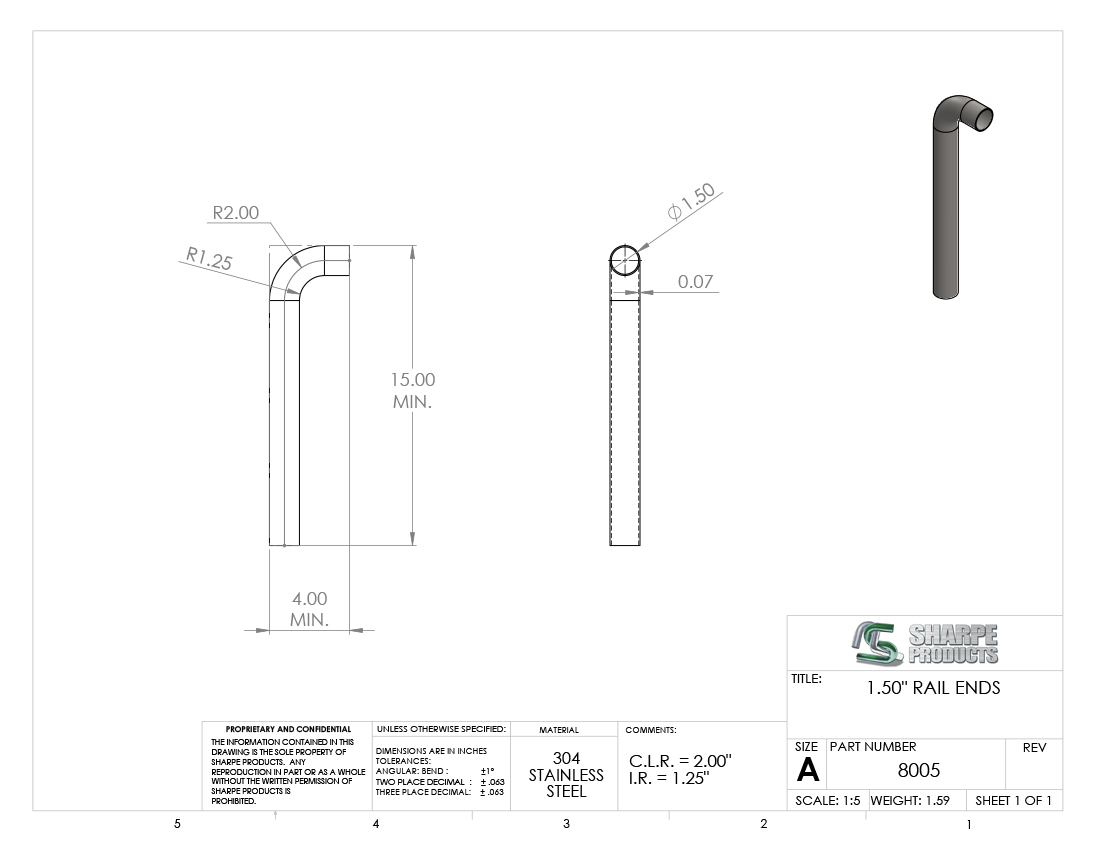 #8005 - STAINLESS STEEL 1 1/2" TUBE RAIL END 2" C.L.R.