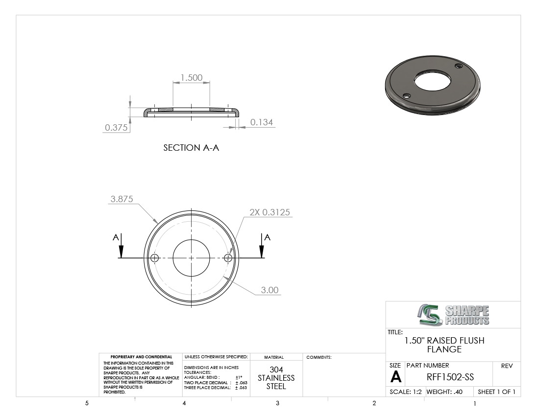 RAISED BASE FLUSH FLANGE, 1 1/2 O.D. W/(2) HOLES, S/S 304