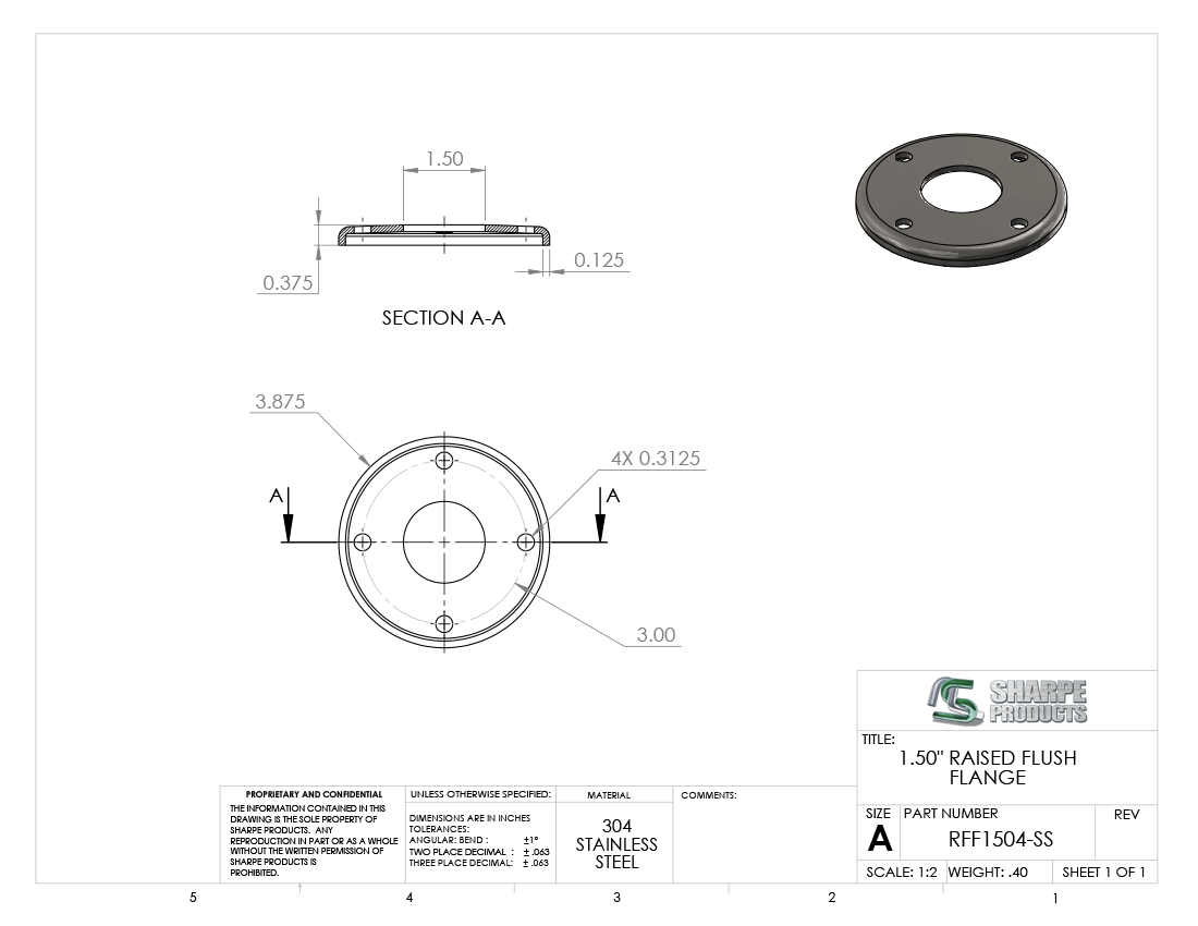 RAISED BASE FLUSH FLANGE, 1 1/2 O.D. W/(4) HOLES, S/S 304