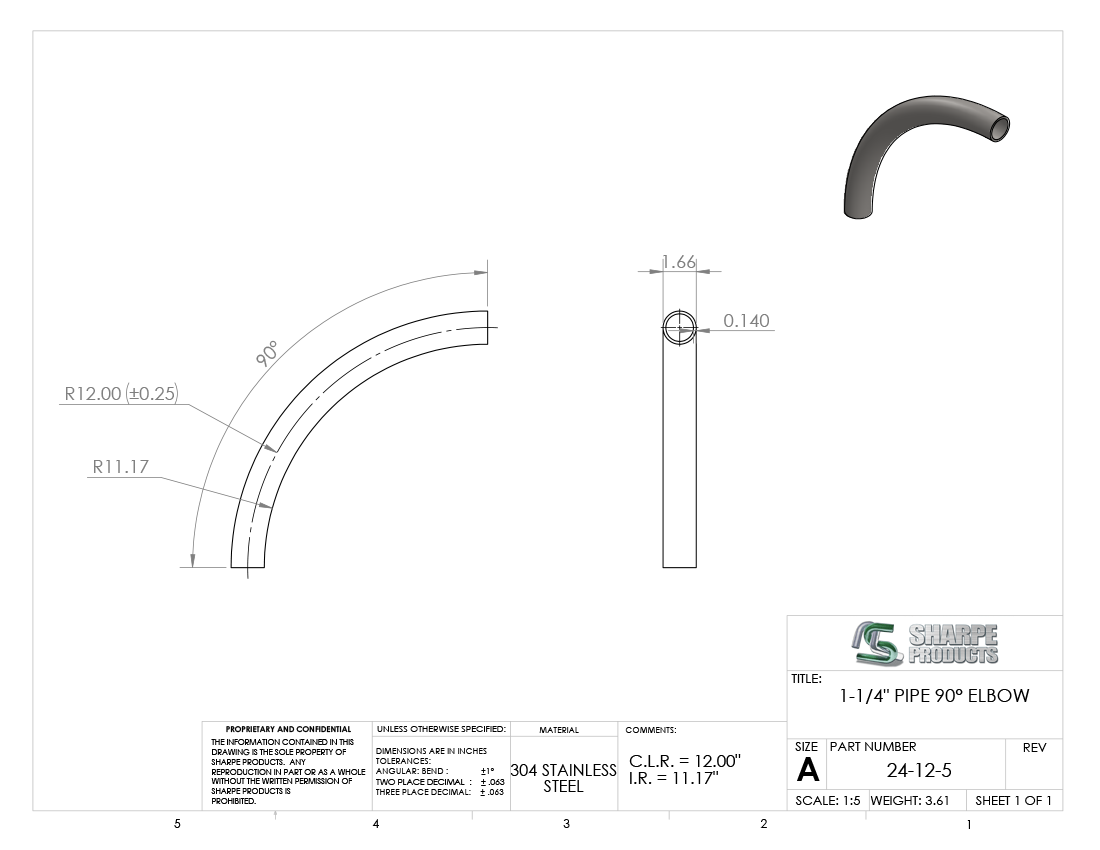 #24-12-5 - STAINLESS STEEL 1 1/4" PIPE 90° ELBOW 12" C.L.R.