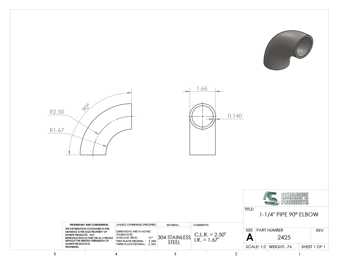#2425 - STAINLESS STEEL 1 1/4" PIPE 90° ELBOW 2.5" C.L.R.