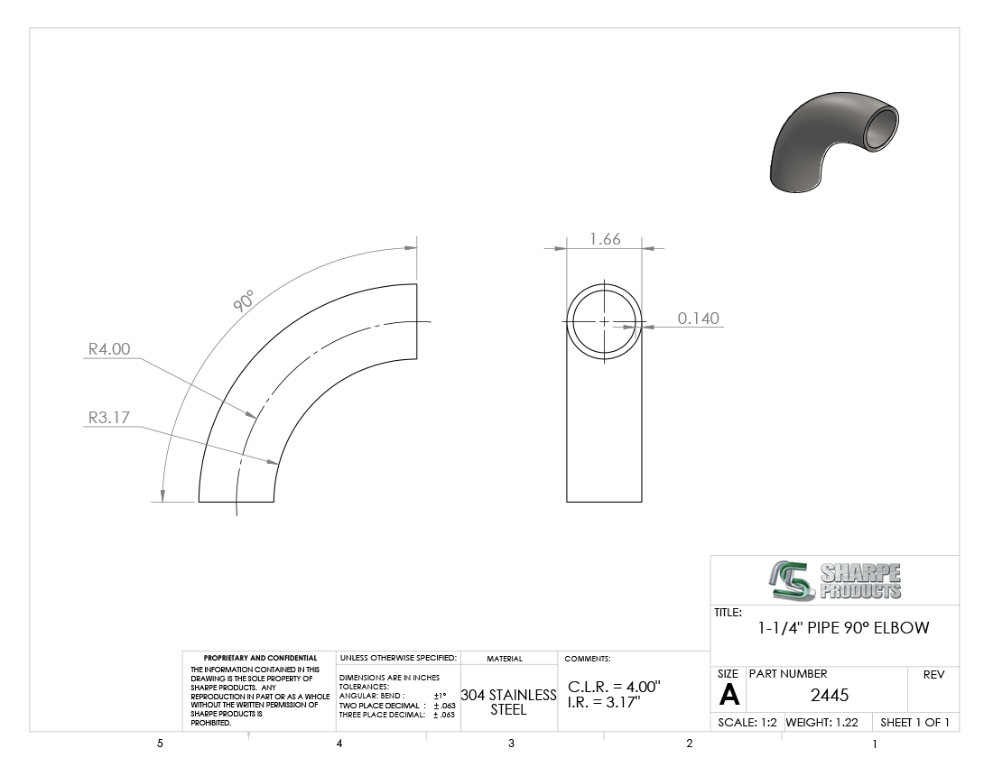 #2445 - STAINLESS STEEL 1 1/4" PIPE 90° ELBOW 4" C.L.R.