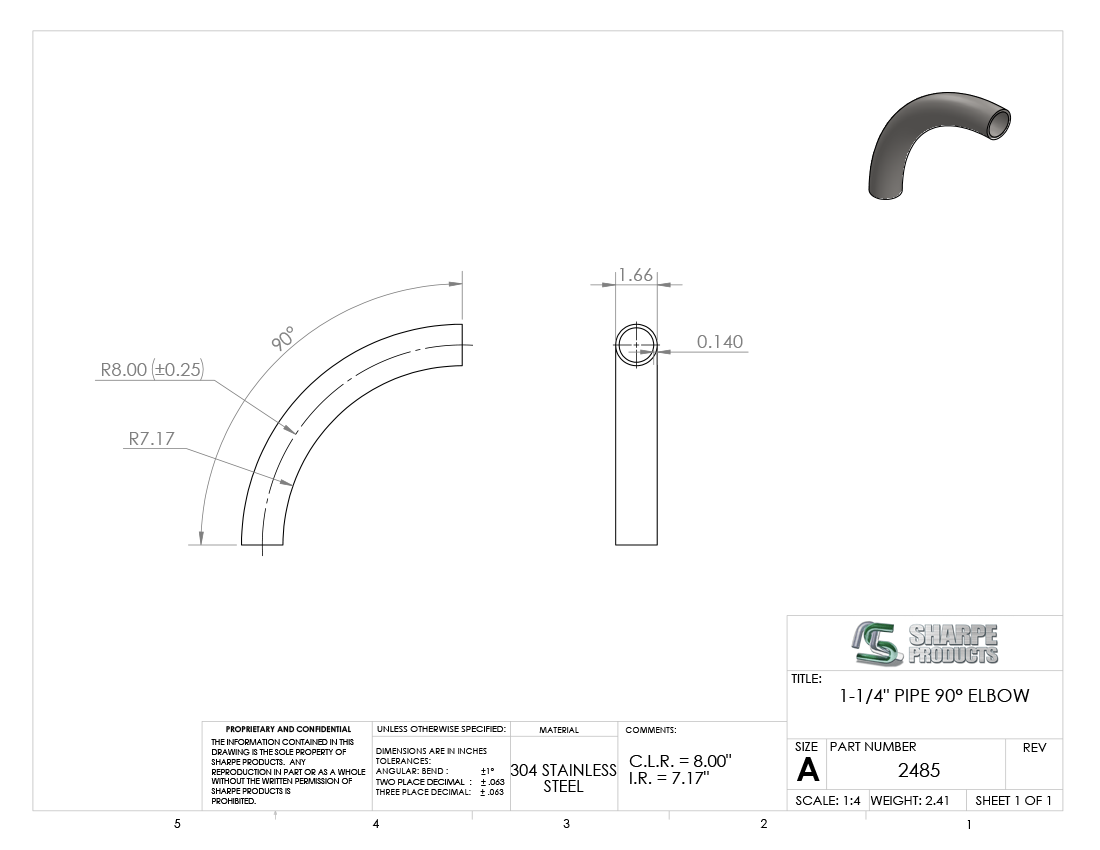 #2485 - STAINLESS STEEL 1 1/4" PIPE 90° ELBOW 8" C.L.R.