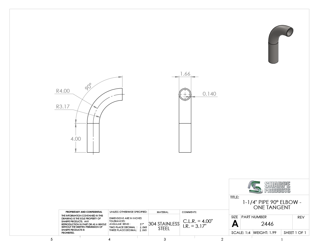 #2446 - STAINLESS STEEL 1 1/4" PIPE 90° ELBOW W/ 1 TANGENT 4" C.L.R.