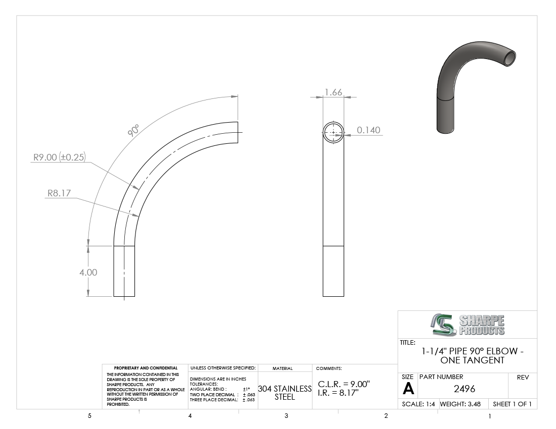 1 1/4 SCH 40 (1.66 O.D.) 90° ELL 9 C.L.R. W/ (1) 4 TAN, S/S 304 NOTE: TOLERANCE IS +/-.25 ON THE RADIUS ** NON-RETURNABLE***