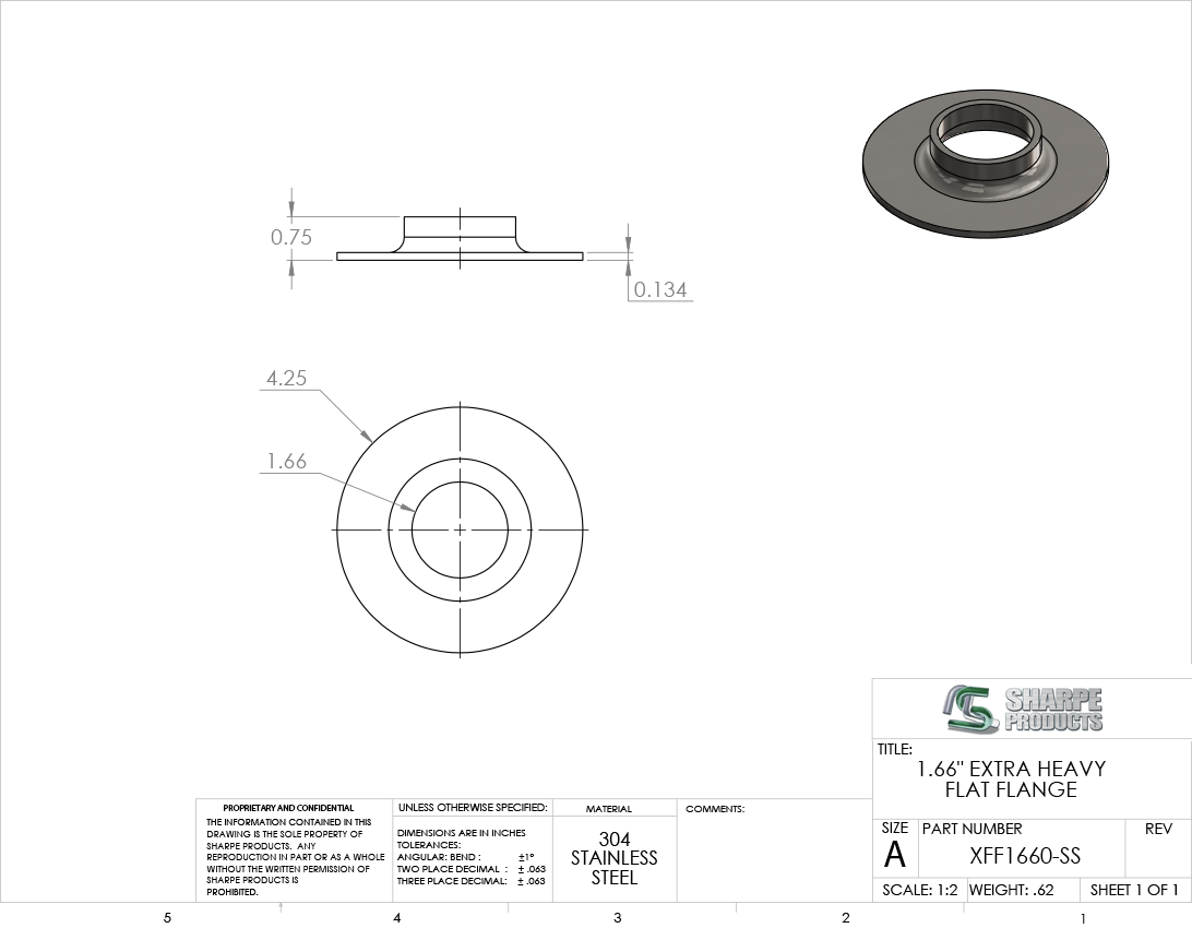 XTRA HVY FLAT FLANGE, 1 1/4 PIPE (1.66 O.D.) PLAIN, S/S 304