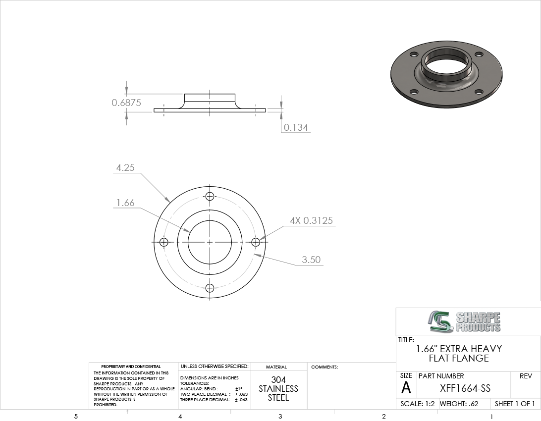 XTRA HVY FLAT FLANGE, 1 1/4 PIPE (1.66 O.D.) W/ (4) HOLES , S/S 304