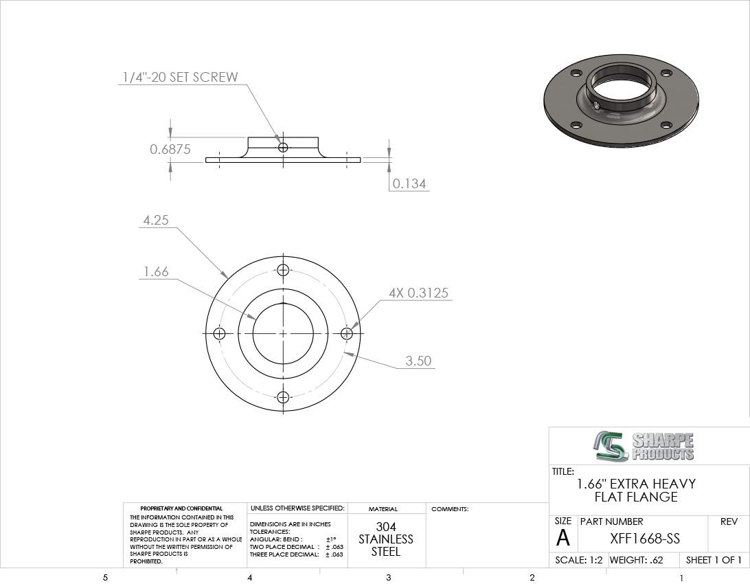 XTRA HVY FLAT FLANGE, 1 1/4 P PIPE (1.66 O.D.) W/ (4) HOLES & SET SCREW, S/S 304