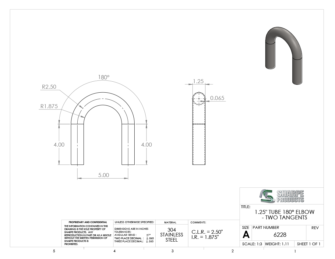 #6228 - STAINLESS STEEL 1 1/4" TUBE 180° ELBOW W/ TANGENTS 2.5" C.L.R.