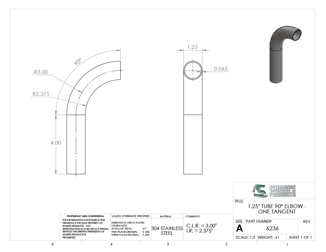#6236 - STAINLESS STEEL 1 1/4" TUBE 90° ELBOW W/ 1 TANGENT 3" C.L.R.