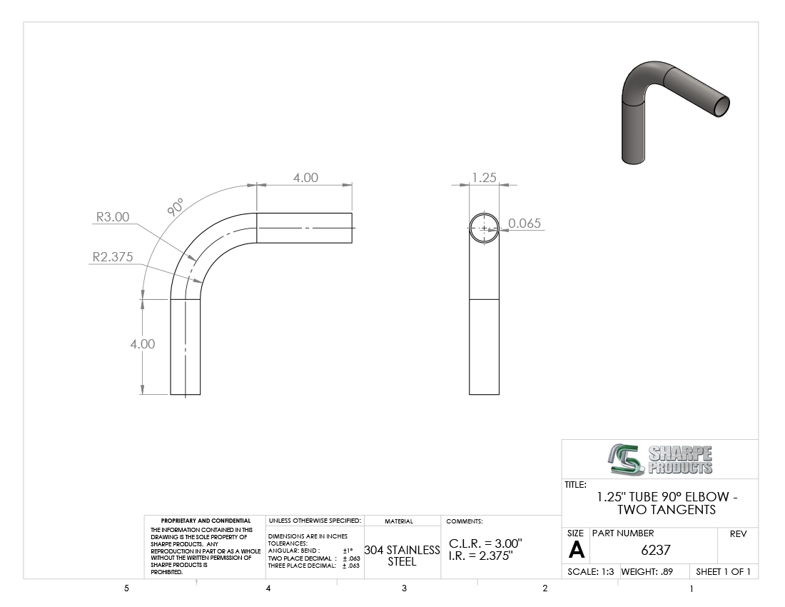 #6237 - STAINLESS STEEL 1 1/4" TUBE 90° ELBOW W/ 2 TANGENTS 3" C.L.R.