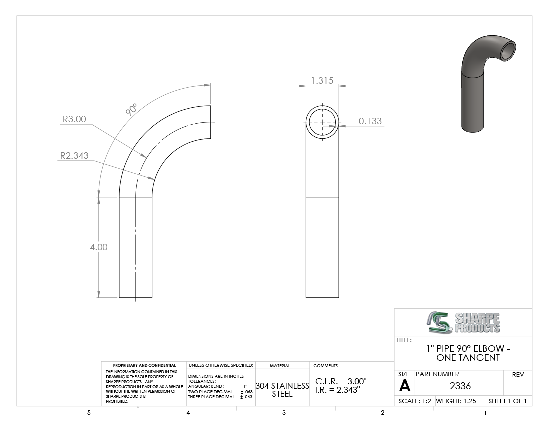 1 SCH 40 (1.315 O.D.) 90° ELL 3 C.L.R. W/ (1) 4 TAN., S/S 304/304L **MILL FINISH