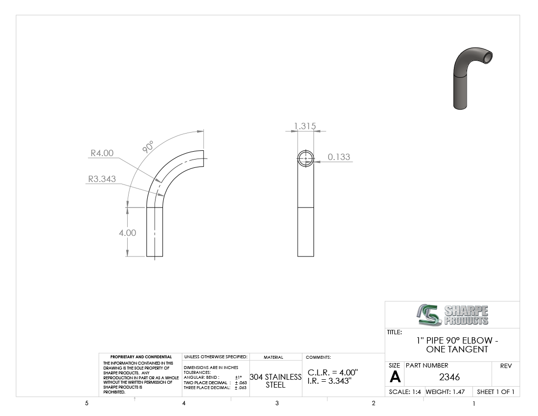 #2346 - STAINLESS STEEL 1" PIPE 90° ELBOW W/ 1 TANGENT 4" C.L.R.