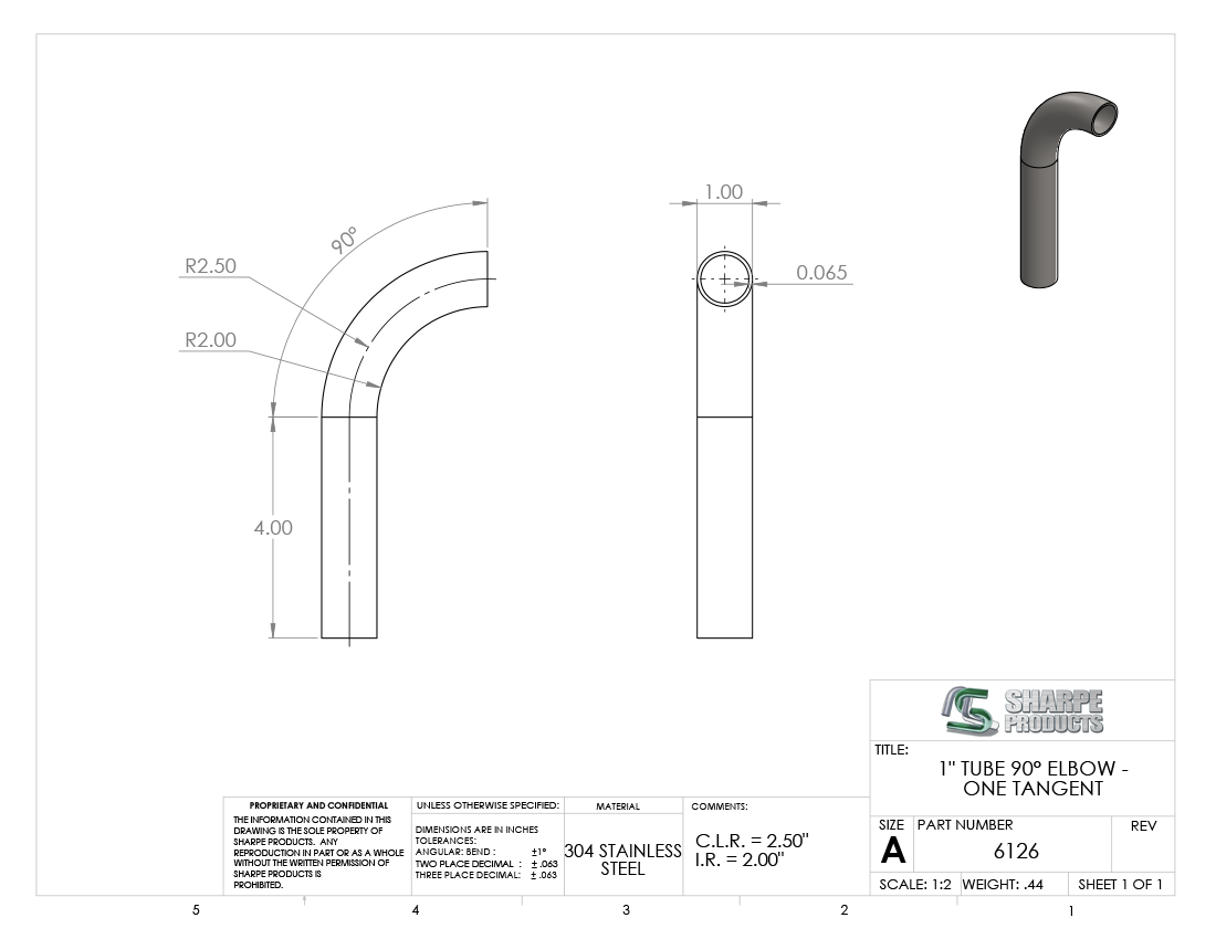#6126 - STAINLESS STEEL 1" TUBE 90° ELBOW W/ 1 TANGENT 2.5" C.L.R.