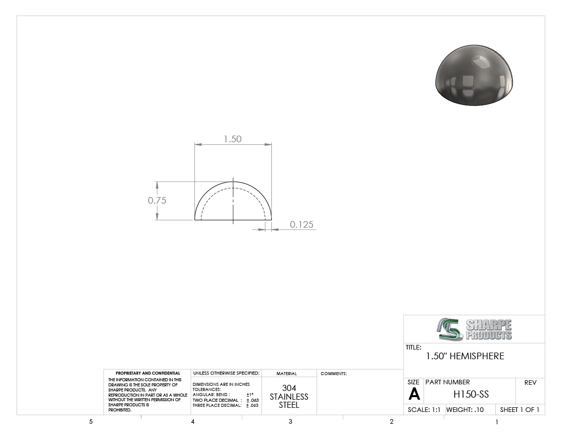 HEMISPHERE S/S (304), 1 1/2 DIA. X 11 GAGE (.120)