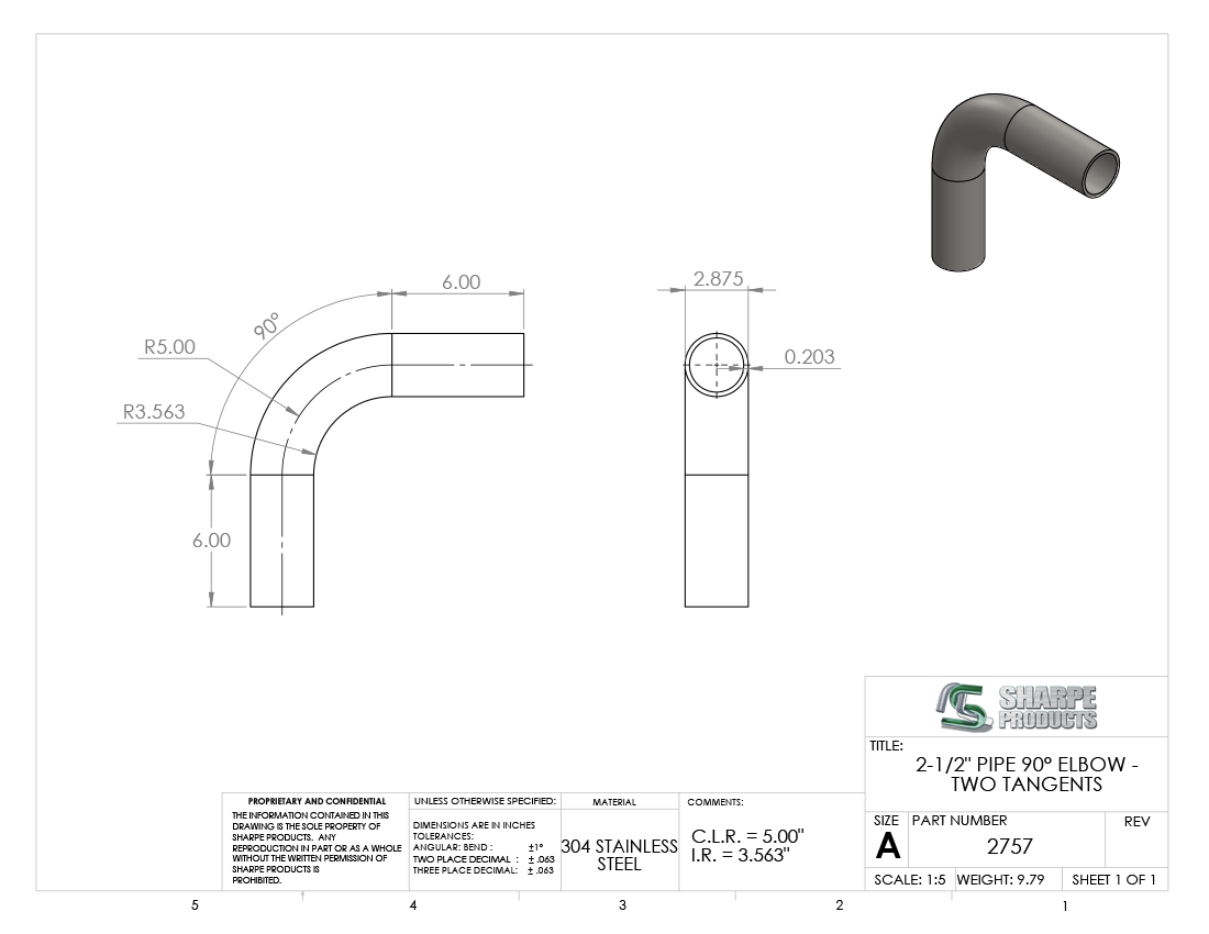 2 1/2 SCH 40 (2.875 O.D.) ELL 90° 5: C.L.R. (2) 6 TAN, SS 304/304L **NON-RETURNABLE*** NOTE: TOLERANCE IS +/-.25 ON THE RADIUS