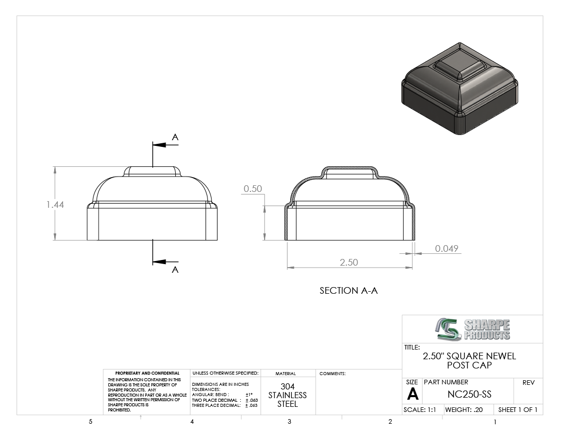 NEWEL CAP, 2 1/2 X 2 1/2, S/S 304