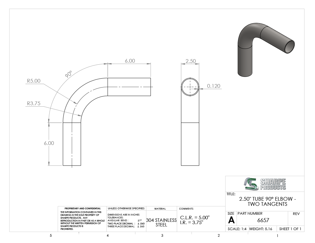 2 1/2 O.D. X .120 WALL (11 GAGE) 90° ELL 5 C.L.R. W/ (2) 6 TANS., S/S 304/304L