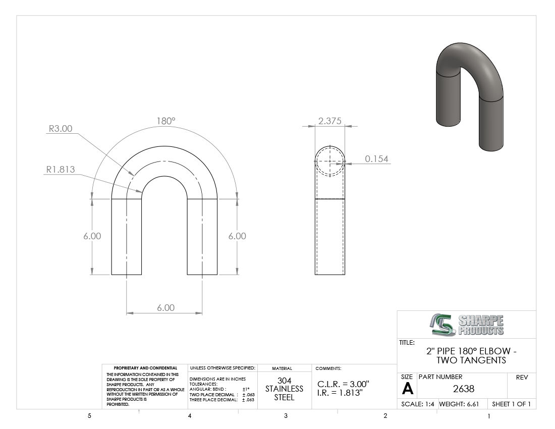 #2638 - STAINLESS STEEL 2" PIPE 180° ELBOW W/ TANGENTS 3" C.L.R.