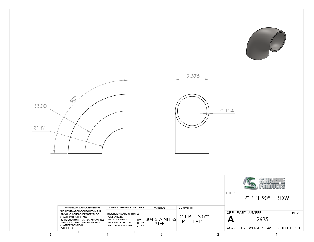 #2635 - STAINLESS STEEL 2" PIPE 90° ELBOW 3" C.L.R.