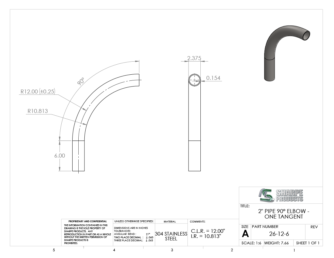 2 SCH 40 (2.375 O.D.) 90° ELL 12 C.L.R. (± .25) W/ (1) 6 TAN., S/S 304/304L **MILL FINISH NON-RETURNABLE ITEM
