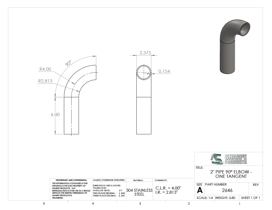 #2646 - STAINLESS STEEL 2" PIPE 90° ELBOW W/ 1 TANGENT 4" C.L.R.