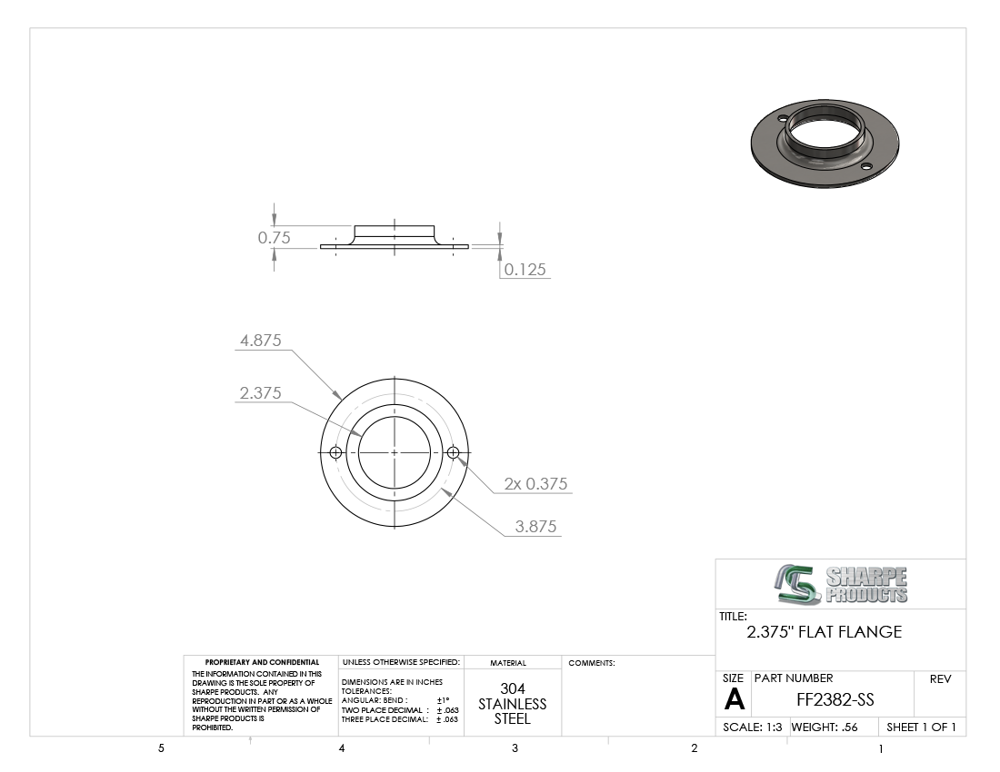 FLAT FLANGE, 2 PIPE (2.38 O.D.) W/ (2) HOLES, S/S 304
