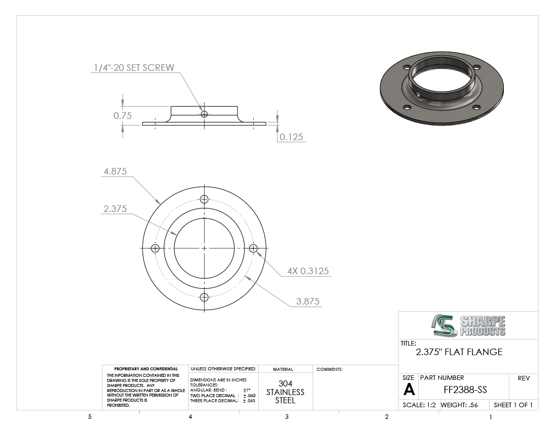 FLAT FLANGE, 2 PIPE (2.38 O.D.) W/ 4 HOLES, & SET SCREW S/S 304