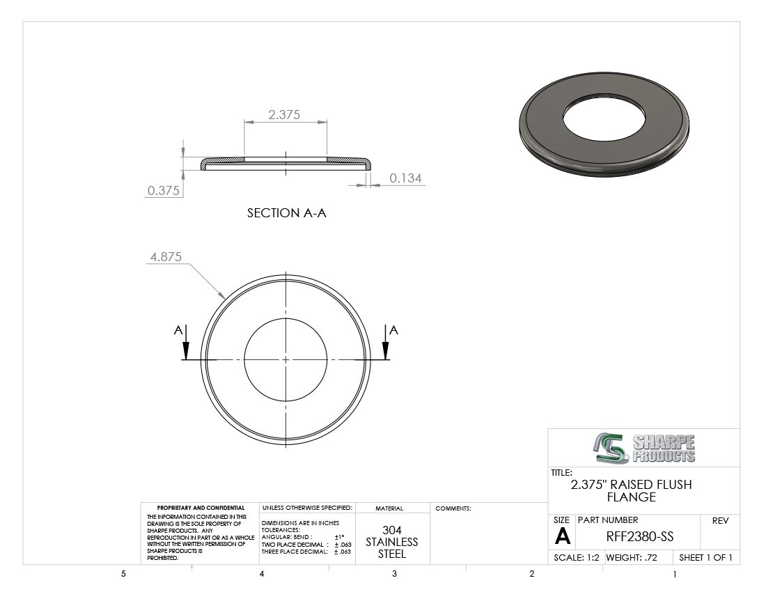 RAISED FLUSH FLANGE, 2 PIPE (2.375 O.D.) PLAIN, S/S 304