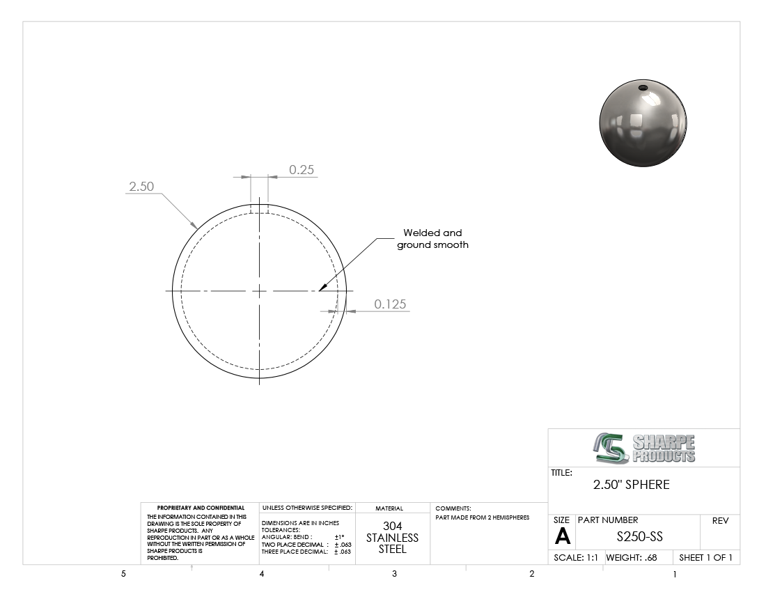 #S250-SS - STAINLESS STEEL 2.5" DIA. SPHERE