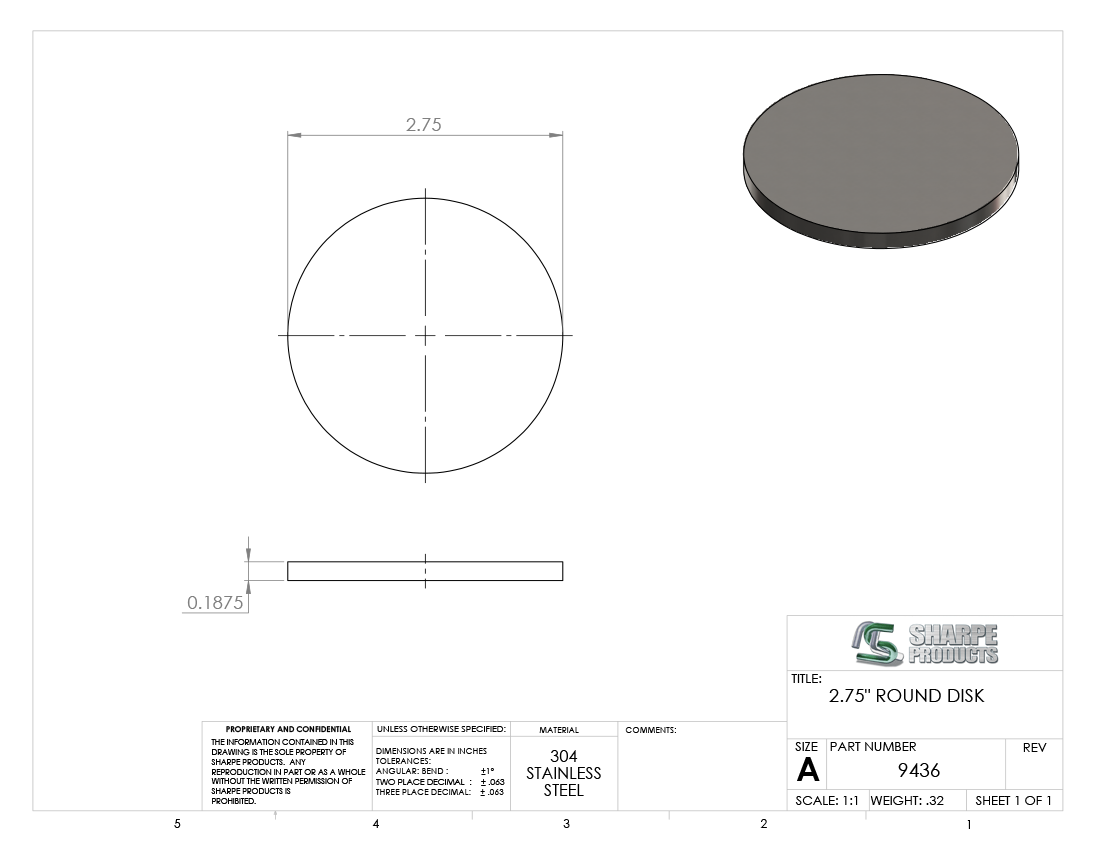DISK S/S 304, 2 3/4 DIA. X 3/16 THICK