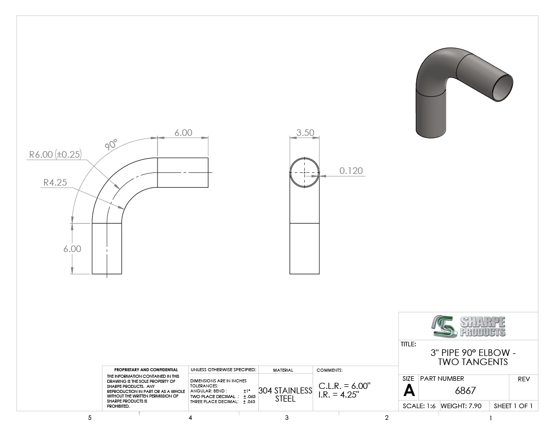 3 SCH 10 (3.50 O.D.) 90° ELL 6 C.L.R. W/ (2) 6 TANS., S/S 304/304L **NON-RETURNABLE*** NOTE: TOLERANCE IS +/-.25 ON THE RADIUS
