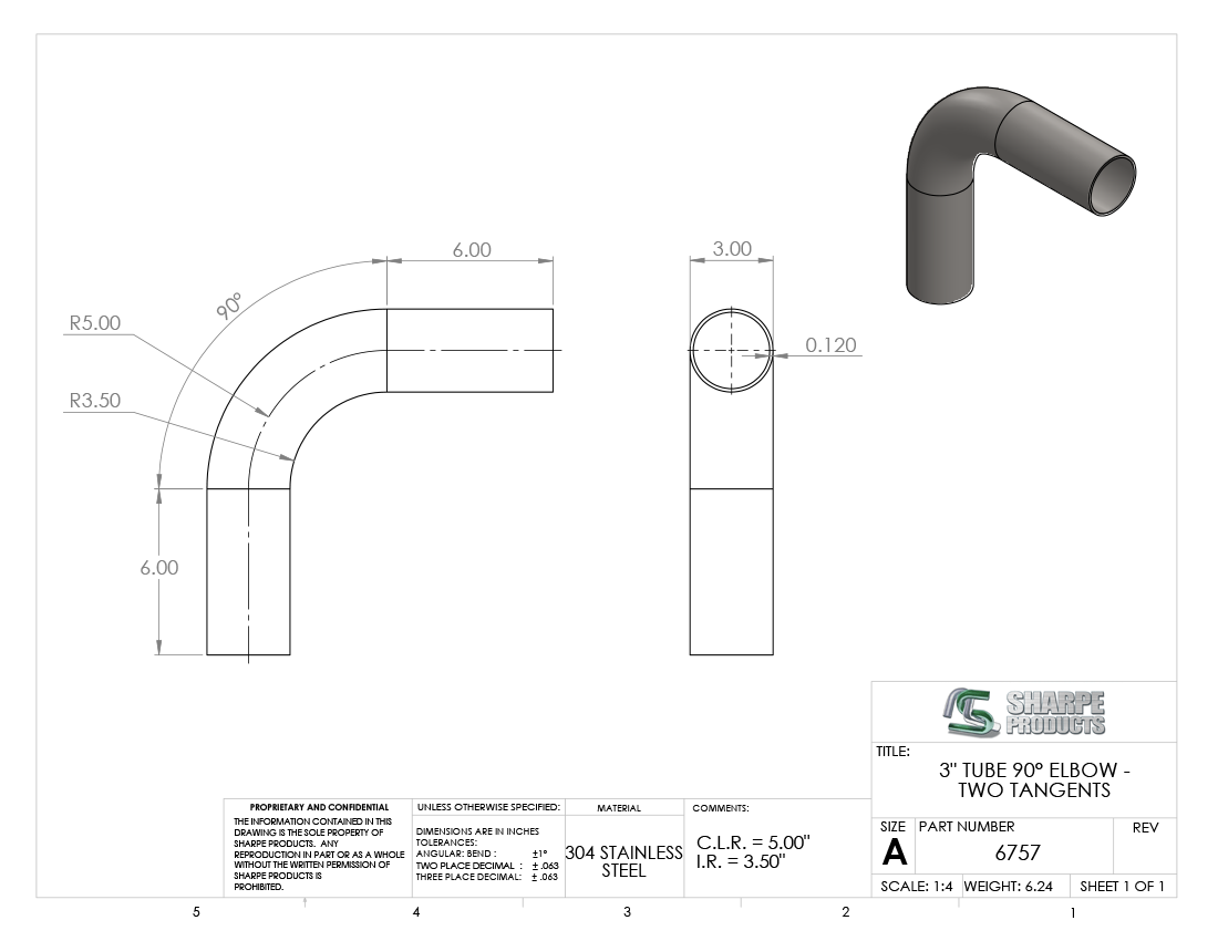 3 O.D. X .120 WALL (11 GAGE) 90° ELL 5 C.L.R. W/ (2) 6 TANS., S/S 304/304L