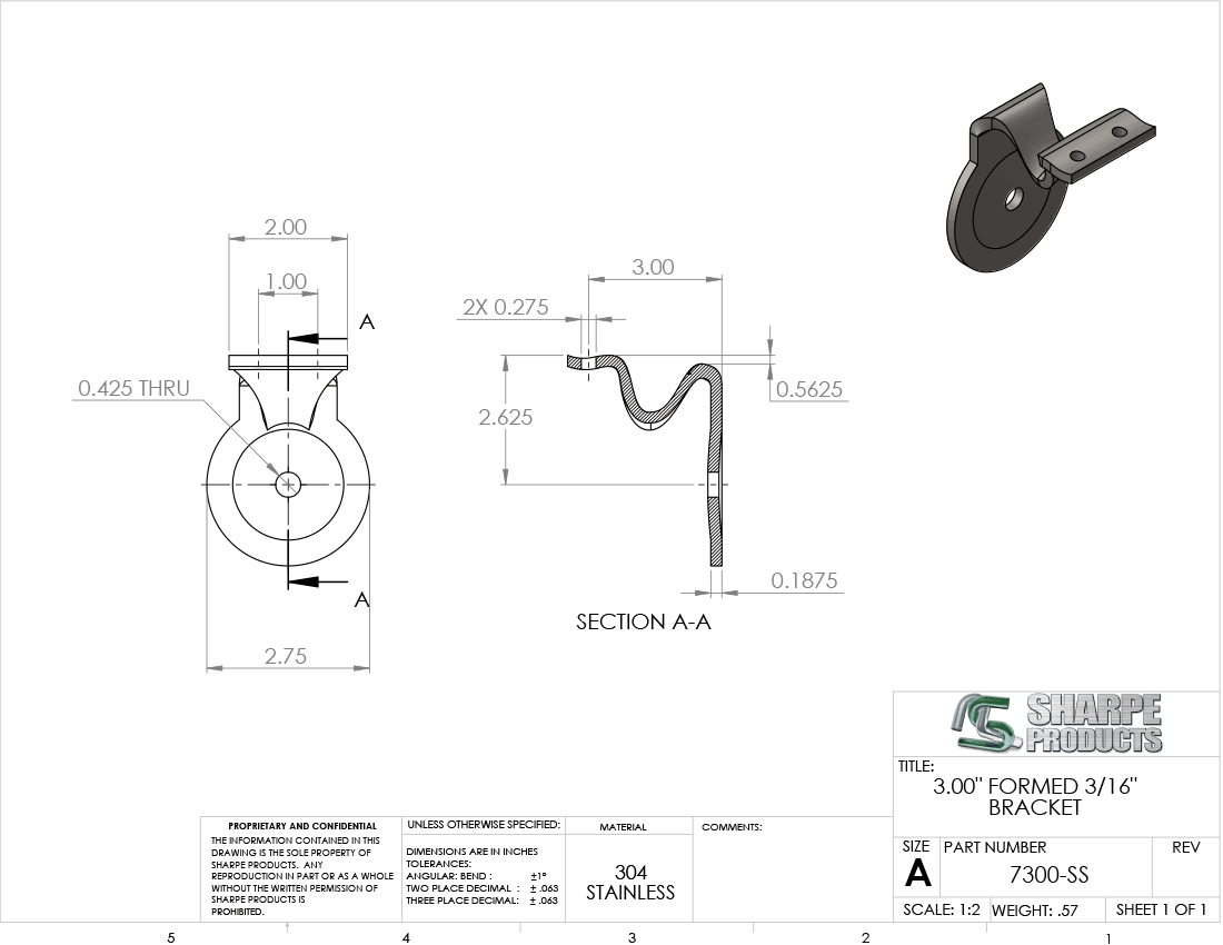 #7300-SS - STAINLESS STEEL 3/16" FORMED BRACKET, 3" C.L.