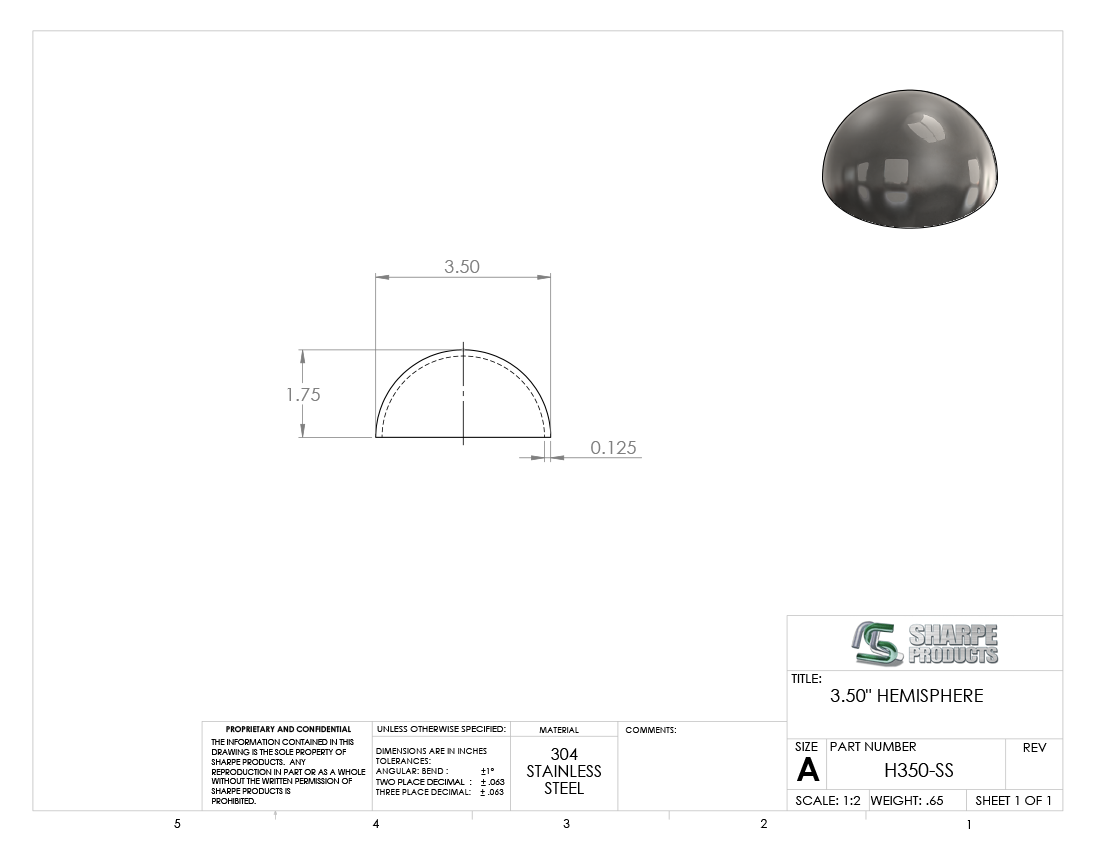 HEMISPHERE S/S (304), 3 1/2 DIA. X 11 GAGE (.120)