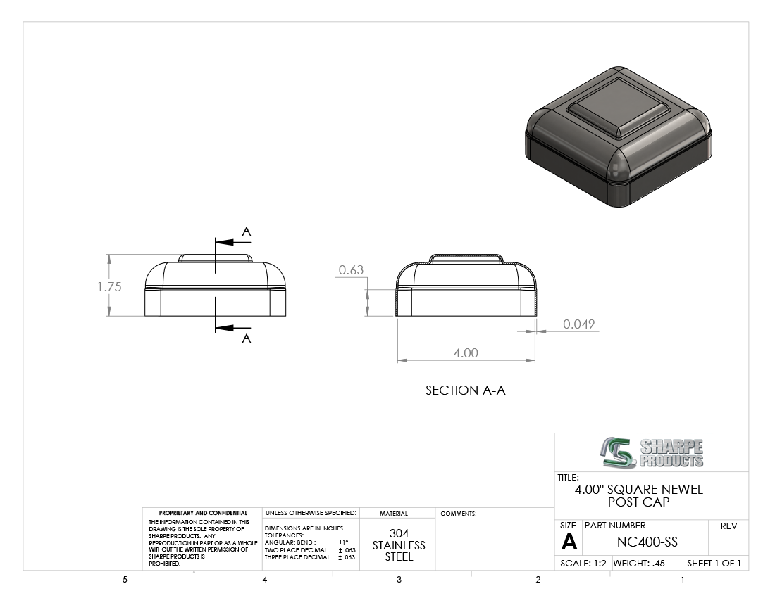 NEWEL CAP, 4 X 4, S/S 304