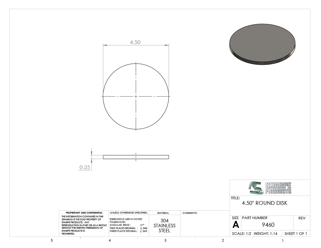DISK S/S 304, 4 1/2 DIA. X 1/4 THICK