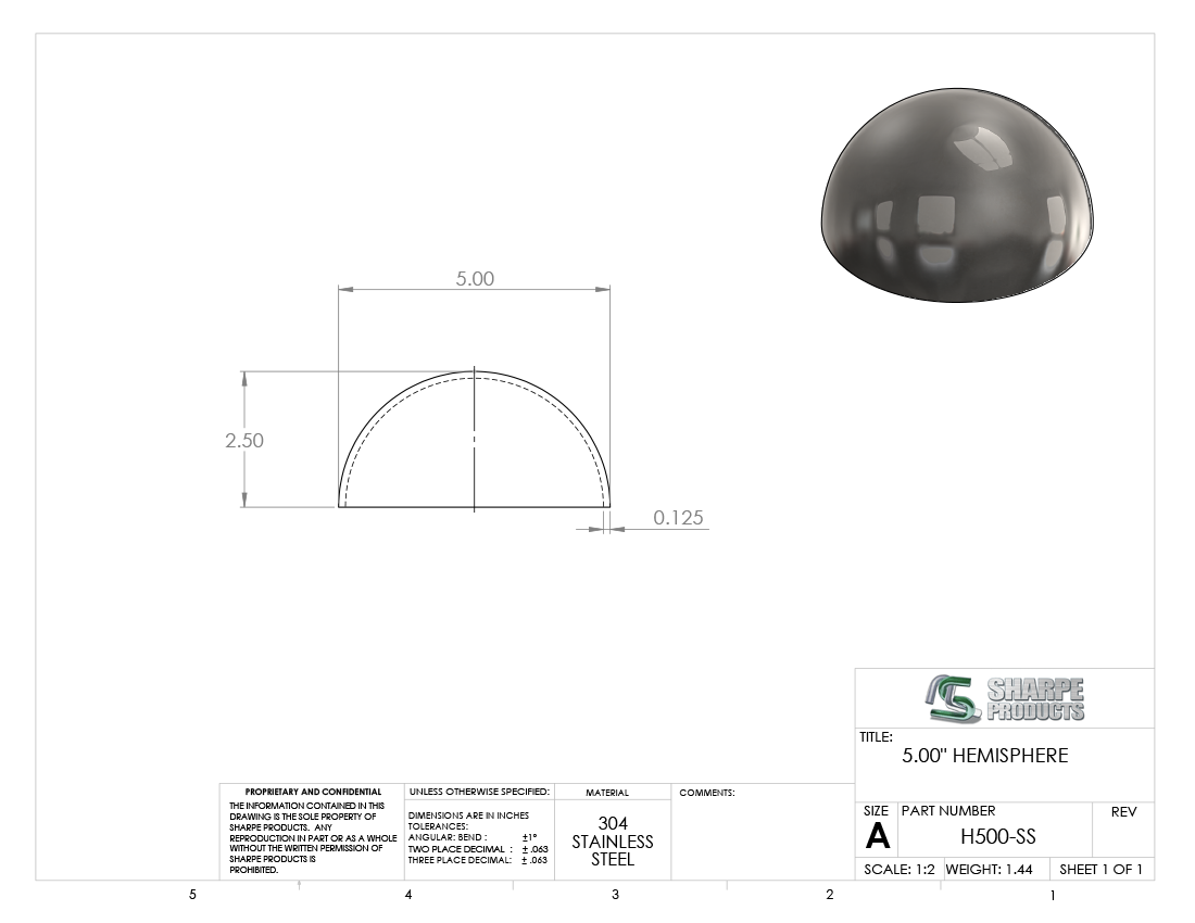 HEMISPHERE S/S (304), 5 DIA. X 10 GAGE (.134)