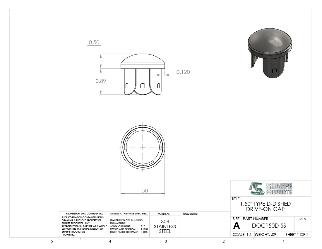 DRIVE ON CAP DISHED, 1 1/2 O.D. (FOR .120 WALL) TYPE D, S/S 304 **W/ #4 SATIN FINISH
